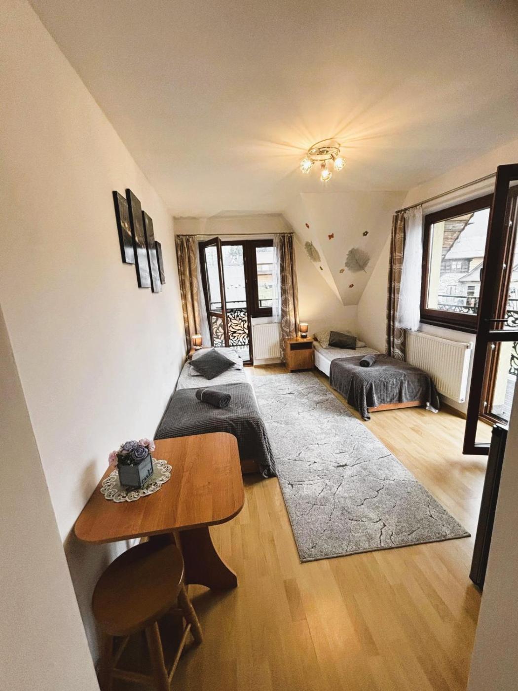 Duży pokój z 2 łóżkami pojedynczymi. Guests will find a stovetop, a refrigerator, a dishwasher and kitchenware in the kitchen. The twin room also offers a barbecue. The twin room provides a wardrobe, an electric kettle, a balcony with mountain views as well as a shared bathroom featuring a hairdryer. The unit offers 2 beds. Pokój z 2 łóżkami pojedynczymi - 2 osobowy. Powierzchnia pokoju ok.: 14 mkw.