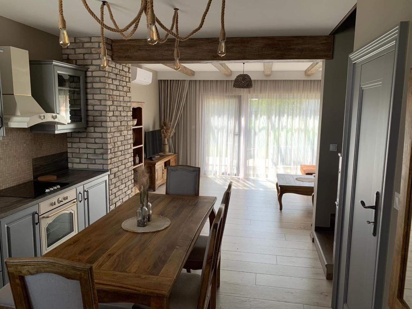 Dom z 3 sypialniami. This holiday home provides a private pool. Guests can make meals in the kitchen that comes with a stovetop, a refrigerator, a dishwasher and kitchenware. The air-conditioned holiday home offers a flat-screen TV with satellite channels, a washing machine, a private entrance, a tea and coffee maker as well as garden views. The unit offers 4 beds. Dom wakacyjny - 8 osobowy. Powierzchnia pokoju ok.: 80 mkw.